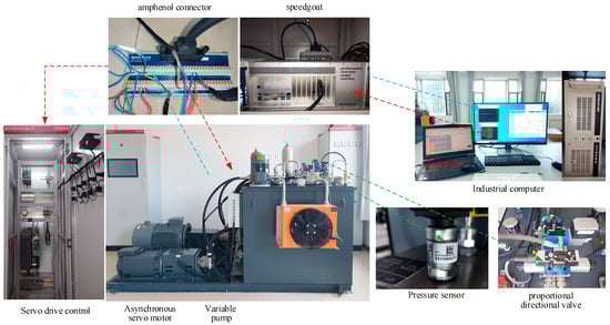 To verify the responsiveness and anti-interference performance of the proposed algorithm, experiments were conducted on the dynamic source test platform under different system pressure values using the proposed algorithm. Simultaneously, the input signal of the proportional directional valve was adjusted as the disturbance value. The experimental results of the proposed algorithm were compared with those of PID control. As shown in Figure 9, the test platform mainly consists of an asynchronous servo motor, a variable displacement pump, a pressure sensor, a relief valve, a three-position four-way proportional directional valve, a Speedgoat controller, a servo drive controller, and an upper computer. The Speedgoat board model is IO133, and the servo drive control unit is CU310-2 PN, which communicate in real time via an Ethernet cable. Since the Speedgoat control terminal uses voltage inputs and outputs, an isolation module for current-to-voltage conversion is required for the pressure sensor. The specific parameters of the test platform are shown in Table 5.