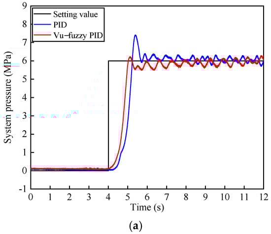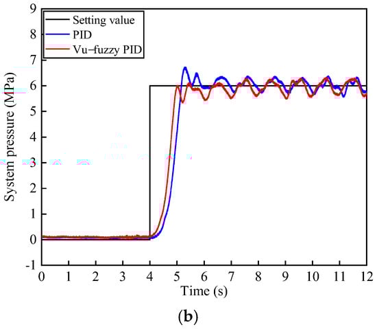 To investigate the step response of the system pressure under the two algorithms, the initial pressure was set to 0 MPa, stepping to 6 MPa after 4 s, as shown in Figure 11. In Figure 11a, the voltage of the three-position four-way proportional directional valve was set to 3.4 ± 0.1 V with a frequency of 1.5 Hz, while in Figure 11b, the voltage was set to 3.4 ± 0.2 V with a frequency of 1 Hz. From both Figure 11a,b, it can be observed that compared to PID control, the proposed algorithm reduces the response time by 6.8% and 8.2%, respectively, and decreases the overshoot by 16.2% and 10.3%, respectively. The steady-state error is approximately the same for both algorithms, around 0.4 MPa. Comparing Figure 11b with Figure 11a, it can be seen that as the disturbance frequency and valve opening increase, the overall pressure fluctuation under both control algorithms becomes larger, approximately 0.65 MPa.
