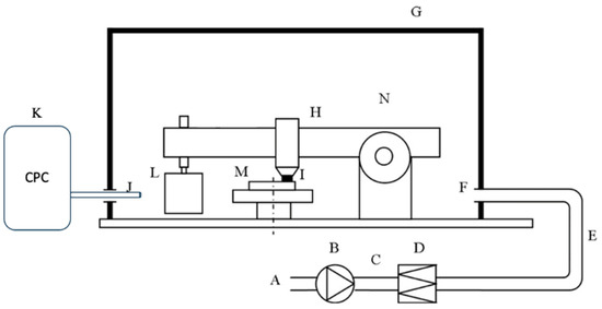 Schematic of the test equipment. (A) room air; (B) fan; (C) flow rate measurement point; (D) filter; (E) flexible tube; (F) inlet for clean air, measurement point; (G) closed box (chamber); (H) POD machine; (I) pin sample; (J) air outlet, particle measurement points; (K) condensation particle counter (CPC); (L) dead weight; (M) rotating disc sample; (N) air inside the box, well mixed. Adapted from Olofsson et al. [24].