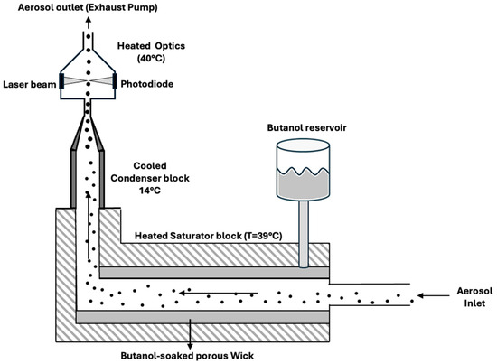 Figure 3 illustrates a Condensation Particle Counter (Model 3750, TSI® Incorporated, Shoreview, MN, USA) used to measure particle emissions. It was connected to the outlet (J) of the pin-on-disk (Figure 1). This CPC can detect particles as small as 7 nm in diameter up to 1 µm, operating at an aerosol flow rate of 1.0 L/min and measuring concentrations from 0 to 105 particles/cm3. The measurement uncertainty was below 5% of the full-scale output. The operating principle of the CPC involves continuously exposing an aerosol sample to butanol, which evaporates within the heated porous wick of the saturation block, developing a saturated aerosol sample. This sample is subsequently cooled in the condenser block through the diffusional thermal cooling method, which facilitates the nucleation and growth of particles into larger supersaturated droplets. These droplets are transported through a nozzle and are optically detected and counted as they cross a laser beam. This CPC operates in photometric mode and single-particle counting mode. The photometric mode is used when the concentration of particles exceeds 103 particles/cm3, where the total scattered light is converted into the particle number concentration. Conversely, the single-particle counting mode is used for lower particle concentrations where each particle is individually detected and counted, providing more precise particle measurements.