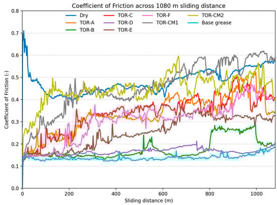 Under lubricated conditions with the TOR products, longer sliding distances gradually increased the mean coefficient of friction. This suggests a depletion of TOR product film in the wheel–rail contact over time. The larger error bars scattered around the mean COF of TOR-A and TOR-C reflect higher variability in friction levels than the other TOR products. This could be attributed to the uneven distribution of Lignin and Kaolin solid particles within the base medium of TOR-A and TOR-C. Conversely, TOR-CM2, TOR-B, TOR-D, and base grease with narrower error bars suggest more predictable and reliable performance in controlling the friction at the wheel–rail contact.