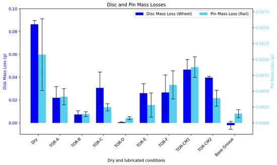 The disc (wheel) mass loss after the 1080 m sliding test is notably greater than the pin (rail), except for TOR-D and base grease (see Figure 6). The highest pin and disc mass losses are associated with the dry condition, followed by the TOR-CM1. However, the lowest pin and disk mass losses are attributed to TOR-D, containing the soft Calcium Acetate solid particles that resulted in the lowest friction levels. The commercial TOR-CM2 yielded lower pin and disk mass losses than the TOR-CM1. Under lubricated contact with the base grease, the disc mass loss shows a negative value of −0.0089 g.