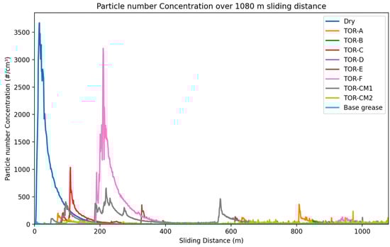 Figure 7 illustrates that dry wheel–rail contact led to a significant peak of particle number concentration exceeding 3500 particles/cm3 during the initial 50 m of the test, followed by a sharp decline with the sliding distance, ultimately stabilising at negligible levels after sliding for 200 m. TOR-A, TOR-C, TOR-E, and TOR-CM1 generated lower peaks of particle number concentration, below 1000 particles/cm3, after the first 50 m of sliding. The non-visibility of the curves corresponding to TOR-B, TOR-D, and base grease reflect negligible particle number concentration over the 1080 m sliding test.