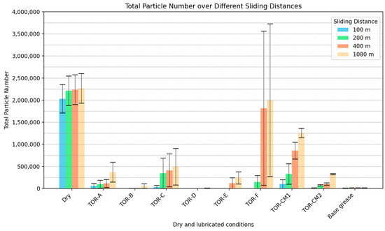 Figure 8 shows that the total particle number accumulates throughout the sliding distance for all the test conditions. Under dry conditions, the particles were mostly generated during the initial 100 m of sliding (2.1 million out of 2.25 million). Conversely, the particle emission is more pronounced after the initial 100 m of sliding under lubricated conditions. Over the first 400 m of the test, while TOR-CM2 displayed a higher mean COF than TOR-CM1, it generated an approximately eight times lower total particle number. Throughout 1080 m sliding, dry, and lubricated conditions with TOR-F and TOR-CM1 emitted significant levels of total particle number, reaching up to 2.25, 2, and 1.25 million particles, respectively. Conversely, lubricated contact with the laboratory TOR products (TOR-A, TOR-C, TOR-E) and commercial product TOR-CM2 produced significantly lower total particle numbers ranging from 250,000 to 500,500 particles. The lubricated contact with TOR-B, TOR-D, and base grease emitted negligible levels of total particle numbers compared to the other conditions. Despite displaying low friction levels, TOR-F unexpectedly emitted a significant particle number compared to the other lubrication conditions. Additionally, despite the close friction patterns of TOR-A and TOR-C, the latter notably produced more particles.