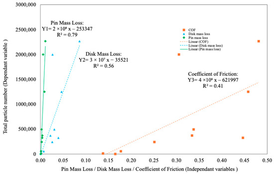 On the other hand, three regression statistical analyses were performed to understand the strength of the relationships between the dependent variable as the total particle number and the three independent variables involving the COF, pin mass loss, and disc mass loss. Three separate regression models were performed for each independent variable to avoid multicollinearity since the COF influences the pin and disc mass losses. The regression analyses included regression statistics such as the coefficient of determination R2 and significance F values used to evaluate the strength and statistical significance of the three relationships. These analyses were performed through MS Excel, along with the Data Analysis Toolpak.