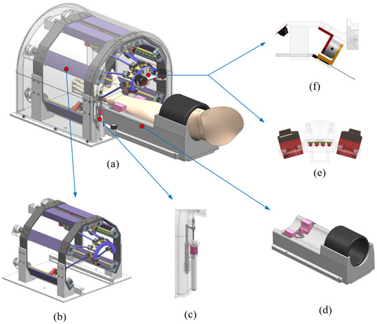 Three-dimensional model of complete machine and each function module: (a) complete machine, (b) needle motion control module, (c) blood collection module, (d) arm support module, (e) venous imaging module, and (f) puncture sensing module.