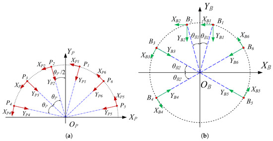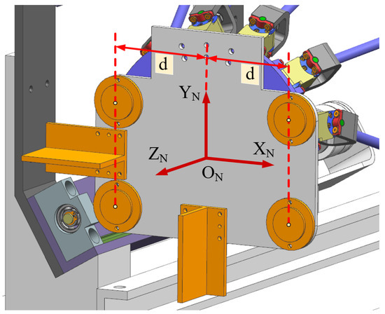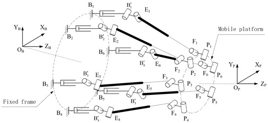 As shown in Figure 6, represents the center point of the hinge axis connected to the link block (which are hereinafter referred to as the “lower joint points”). represents the projection of on the fixed frame’s end plane. is the center of the distribution circle of . represents the center point of the hinge axis connected to the mobile platform (which are hereinafter referred to as the “upper joint points”). is the center of the distribution circle of . The distributions of the upper and lower joint points are shown in Figure 7.