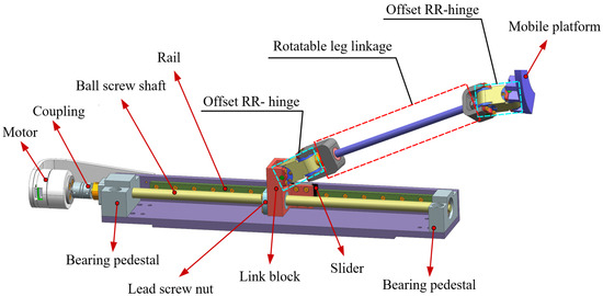 Based on this configuration, the structural design of the needle motion control module is developed, as shown in Figure 2b. The module consists of six P-RR-R-RR kinematic chains that act as support legs, with the structure of each leg shown in detail in Figure 4. Notably, the motion joint uses an offset RR-hinge configuration, where the two hinge axes are mutually perpendicular but do not intersect in space, thus creating an offset between the hinge axes. When compared with spherical hinges and Hooke hinges, this design provides a larger workspace. The mobile platform is semi-annular in shape, thus ensuring a high degree of suitability with the human’s arm. The motor provides the driving force for the ball screw shaft, thus moving the lead screw nut, the link block, and the slider along the guide rail in a linear motion and forming the P-prismatic pair. The offset hinge serves as a motion joint and connects the rotatable leg linkage with the link block and the moving platform, which constitute the RR-revolute pair. The rotatable leg linkage forms the R-revolute pair.