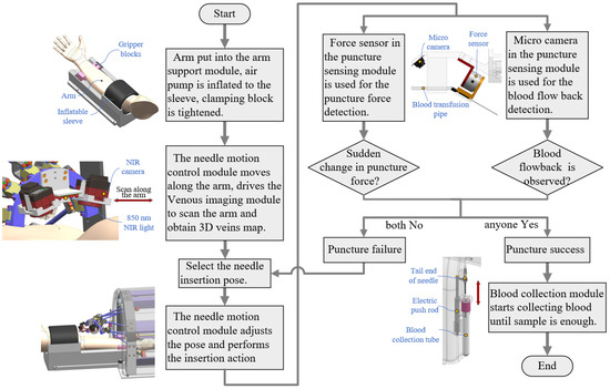 Before the specific design is produced, research and a detailed analysis of the project must be conducted to ensure the feasibility of the venous blood sampling robot design scheme. First, by observing and investigating the operating process for artificial blood sampling performed by medical staff [28,29] in combination with the current technological developments in the robotics field, the workflow for venous blood sampling robots was abstracted, as shown in Figure 1.
