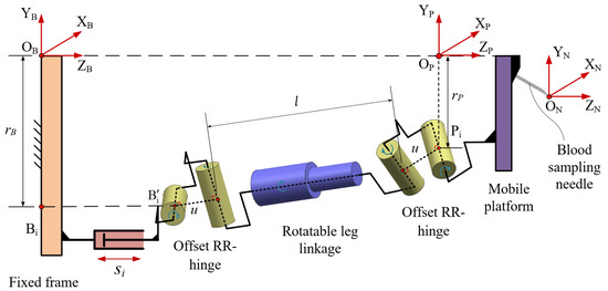 A global coordinate system is established, with as the origin. A local coordinate system of the mobile platform is established at . The blood sampling needle is fixed to the mobile platform, and a local coordinate system of the needle that is parallel to is established at the needle tip . The radius of the upper joint points distribution circle is , and the angle between any two adjacent joint points is . The radius of the lower joint points distribution circle is , which is determined primarily by the parameters and . The hinge offset is denoted by u, the length of the rotatable leg linkage is l, and represents the slider displacement along the guide rail direction (i.e., the -axis). The coordinates of the needle tip in the coordinate system are . The configuration parameters for the parallel mechanism are listed in Table 1.