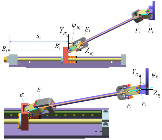 The inverse kinematic analysis of the parallel mechanism is the process of giving the spatial pose of the needle’s local coordinate system within the global coordinate system and then solving for the displacements of the six sliders . Because of the introduction of the hinge offset, new constraint equations need to be established based on the kinematic constraints of the hinges. As shown in Figure 9, point is the center of the connecting axis between the lower hinge and the linkage, while point is the center of the connecting axis between the upper hinge and the linkage. The angle denotes the angle between the axis and the line , and denotes the angle between the axis and the line . These angles and represent the two additional hinge variables introduced by use of the offset hinges.