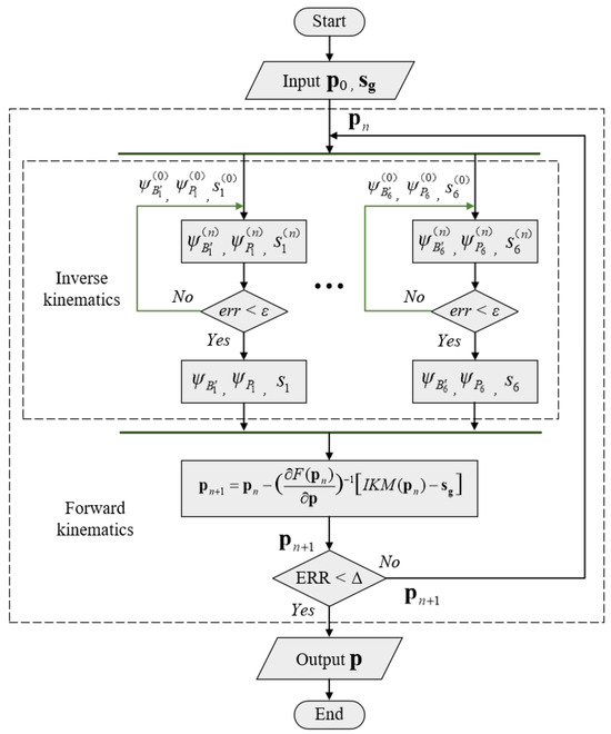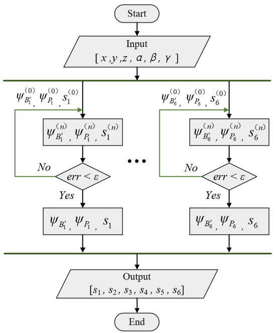 When the initial values are provided and the calculation error tolerance is specified, numerical computations can be performed using the iterative Equation (16). Given the convergence error of , all leg variables in the i-th leg chain can be solved out under the specified error conditions. Consequently, the inverse kinematics solution for the 6-P-RR-R-RR parallel mechanism can be obtained. The numerical iterative solution process for the inverse kinematics of the parallel mechanism is illustrated in Figure 10.
