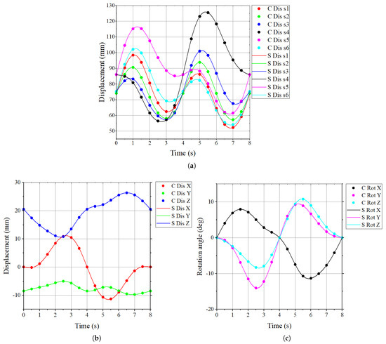 Comparison of kinematic numerical calculation and simulation results (C—numerical calculation results, S—simulation results, Dis—translational displacement, Rot—rotational angle): (a) inverse kinematics result, (b) forward kinematic displacement result, and (c) forward kinematic rotation angle result.