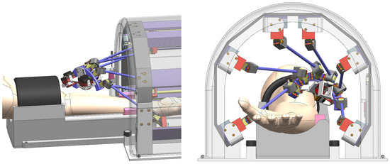 When compared with series robots, parallel robots have advantages that include high precision, compact structures, good rigidity, and fast response speeds [13]. These robots can reach resolutions on the micron level or even the nanoscale and, thus, are finding increasing numbers of applications in the field of medical devices in recent years. Shoham et al. [14] proposed a micro-parallel robot to assist with spinal trauma surgery that can perform accurate positioning and adjust the position of the drill or needle during an operation. Nakano et al. [15] developed a parallel robot for vitreous retinal surgery that can provide micron-scale resolution and micron-level positioning accuracy, and it has demonstrated good operability. Among the multiple configurations of parallel robots, the Gough–Steward 6-DOF parallel platform [16,17] has a unique structure and forms a good fit with the shapes of human limbs, and it has also been used in limb bone traction and fixation equipment. Wendlandt et al. [18] developed an intelligent external bone fixator that can effectively improve the accuracy and stability of bone movement through computer-aided planning, thereby both promoting bone healing and improving the patient’s safety and comfort. Ding’s research team [19] also developed an ankle-foot rehabilitation assist device based on the Stewart platform that can help a patient’s ankle to achieve rehabilitation in six directions with reduced errors to within 0.5 mm.