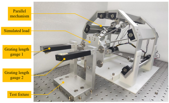 The test system mainly consists of a test fixture, a simulated load, the parallel mechanism under test (i.e., the needle motion control module), and the grating length gauges, as shown in Figure 16. The test zero position is taken to be , and then the translational motion accuracy is tested along the Z-direction. The rotational motion accuracy is tested around the Y-axis. The schematic diagram of the test is shown in Figure 17. The translational displacement along the Z-axis is defined as , and the length variations of the grating scales 1 and 2 are denoted by and , respectively. Therefore, can be expressed as a function of and as follows: