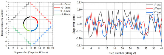 In the translational motion accuracy test, measurements are taken along the Z-axis translation direction within the range from to using a step size of . The test is conducted using the sequence from for three cycles. The test results are shown in Figure 18.