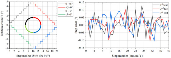 In the rotational accuracy test, the rotation is performed around the Y-axis. The test is conducted within the range from to using a step size of , and it follows the sequence for three cycles. The test results are shown in Figure 19.