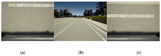 Sample frames were captured from the CARLA simulation environment. The frames include: (a) a downward-facing view from the left-side camera; (b) a forward-facing camera; and (c) a downward-facing view from the right-side camera.