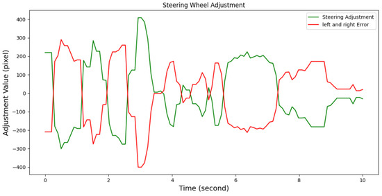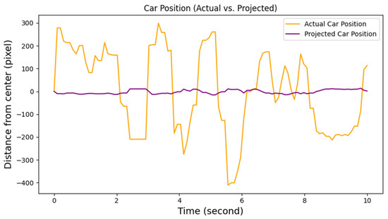 Figure 5 illustrates the projected car position after implementing a PID controller for the steering wheel. It demonstrates that the car consistently remained close to position zero, indicating the car was positioned near the center of the lane. This highlights the effectiveness of the PID controller in maintaining the vehicle’s lateral position and keeping it aligned with the lane center, which is crucial for safe and stable lateral control during driving (Figure 6).