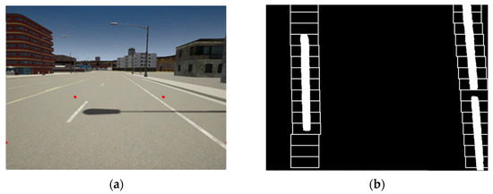 Bird’s-eye view detection: Transformation of the front-facing camera image to BEV and subsequent lane detection: (a) original look-ahead frame with red dots indicating the BEV region of interest (ROI); and (b) processed BEV frame with histogram line detection.