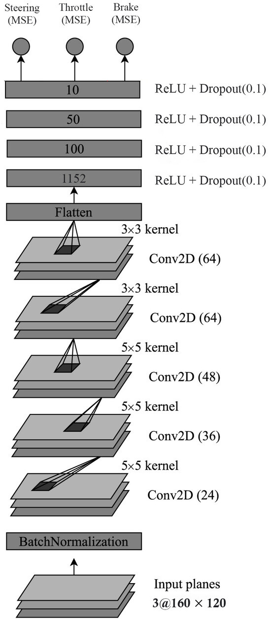The PilotNet implementation in this study follows the design specifications provided by Bojarski et al. [8]. However, for use in the CARLA simulator, the architecture has been adapted to operate on input images and produce three control outputs: steering, throttle, and brake [30]. After incoming camera frames are resized to pixels, they are processed by five convolutional layers. The first three layers use filters with strides of 2 (24, 36, and 48 output channels), and the remaining two layers use filters (stride of 1) with 64 output channels. The feature maps are subsequently flattened and passed through four fully connected layers of sizes 1152, 100, 50, and 10 neurons. Each fully connected layer employs ReLU activation, with a dropout rate of 0.1 to mitigate overfitting. Finally, three parallel output nodes (steering, throttle, brake) each compute a mean-squared error (MSE) loss during training. Figure 8 illustrates a high-level schematic of the PilotNet architecture used in these experiments.