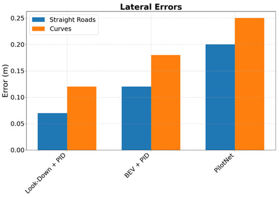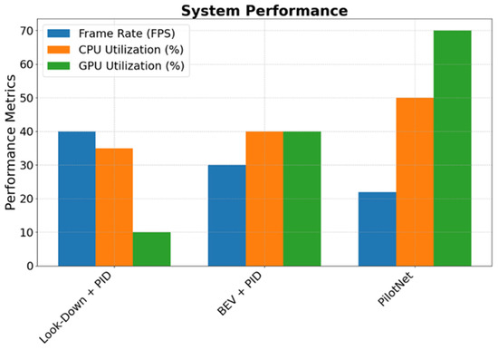 Although our proposed system focuses on lateral control with a near-constant speed, the results in Section 3.5 illustrate how coupling speed adaptation can improve cornering stability. The look-ahead and look-down PID methods do not inherently slow on curves unless a predefined speed schedule is introduced. By contrast, PilotNet automatically modulates the throttle, showing lower average speeds on sharper curves. However, this approach demands extensive training and is less transparent. Future work will integrate a more advanced longitudinal controller (e.g., MPC or an adaptive rule-based approach) with the look-down method to optimize both speed and steering. To further clarify the comparative advantages of different lateral control methods, Table 3 summarizes key performance aspects [14,31,32,33,34].