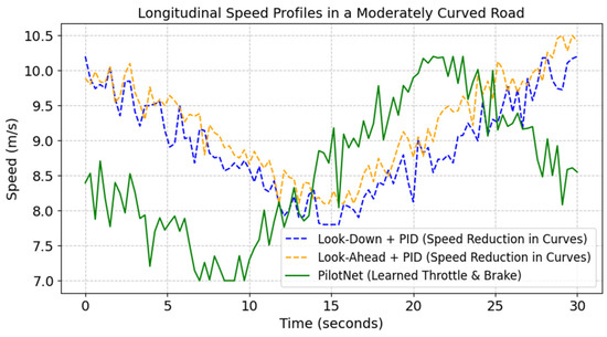 Although our main focus is on lateral control, we also recorded the longitudinal speed profiles for each method—(i) look-down + PID, (ii) look-ahead + PID, and (iii) PilotNet—to investigate how speed varies during lane-keeping tasks. Unlike the first two methods, which apply a fixed (or minimally adaptive) throttle, PilotNet inherently learns throttle and brake from training data, potentially allowing it to slow down on curves.