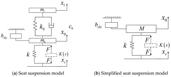 The design of a system with multiple degrees of freedom, the semi-active control algorithm, is more complex, making its practical engineering implementation challenging. Therefore, the human–seat model in Figure 2a is simplified into a whole, as shown in Figure 2b, for a simpler controller design that is more easily applicable in practical applications. The simplified seat model is as follows: