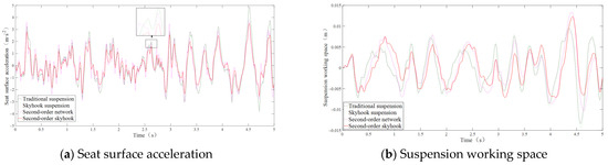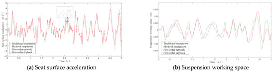 The RMS value of dynamic travel remains stable and does not exhibit a decline when comparing the performance of the first- and second-order networks. Furthermore, the RMS value of the second-order skyhook seat inertial suspension is markedly lower than that of the first-order system. Considering the frequency domain, the second-order skyhook seat inertial suspension decreases the frequency of suspension at 0–10 Hz, and the first-order skyhook seat inertial suspension exhibits a degree of degradation in performance within the mid-to-high frequency spectrum. Therefore, the second-order skyhook seat inertial suspension is used as a reference model.