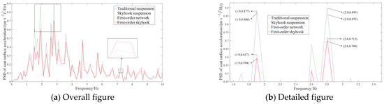 As shown in Table 4 and Figure 4, the time-domain index analysis indicates that the proposed method outperforms the traditional suspension system. Specifically, the RMS values of the skyhook inertial seat surface acceleration and suspension workspace decreased by 3.5% and increased by 9.4%, respectively. The first-order network seat surface acceleration and suspension workspace RMS value decreased by 14.97% and increased by 5.66%, respectively. The RMS value of the acceleration at the seat surface was diminished by 17.06%. The RMS value of the suspension workspace shows significant degradation in both the skyhook inertial control and first-order network configurations, compared to traditional systems. The first-order skyhook seat inertial suspension demonstrates significant performance enhancement over the standard skyhook inertial suspension in time-domain evaluations. Figure 5 illustrates the power spectral density (PSD) of the seat surface acceleration.