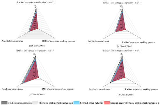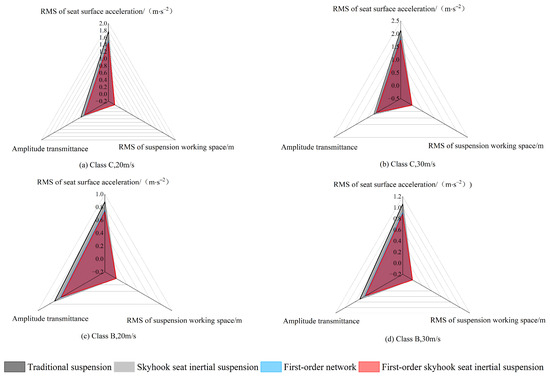 Radar diagram of first-order skyhook seat inertial suspension performance under different road excitation conditions.