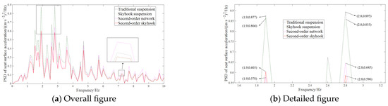 As can be seen from Figure 8 and Table 5, the natural frequencies of suspension occur at 1.9 Hz and 2.8 Hz. Compared to traditional suspension systems, the inherent frequency of the second-order skyhook seat inertial suspension is markedly reduced, with respective reductions of 31.2% and 34.5% at frequencies of 1.9 Hz and 2.8 Hz. This indicates that the second-order skyhook seat inertial suspension system significantly suppresses seat surface vibrations within the low-frequency range. Furthermore, the presence of an inerter significantly lowers the natural frequency of the suspension system. However, it is noteworthy that the seat surface acceleration of the first-order skyhook seat inertial suspension exhibits a degree of deterioration at mid to high frequencies [42]. The PSD of seat surface acceleration in the second-order skyhook seat inertial suspension does not deteriorate. Full spectrum optimization is achieved. The second-order skyhook seat inertial suspension system demonstrates superior performance compared to its first-order counterpart.