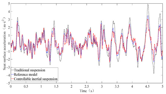 Although the second-order skyhook seat inertial suspension has many components and is difficult to engineer, it was selected as a reference model because of its excellent performance. AFSMC was employed to ensure that the dynamic deviation between the actual and reference models converges to zero during the sliding phase. The results show that the actual model performs similarly to the reference model under sliding-mode control, leading to a superior frequency response for seat quality within the lower frequency spectrum.