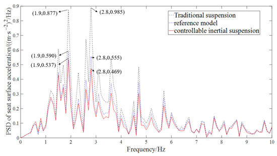 As can also be seen in Figure 5, the natural frequencies of suspension are 1.9 Hz and 2.8 Hz. In contrast, the first-order skyhook seat inertial suspension system has a significantly lower natural frequency, with decreases of 32.3% and 21.7% at 1.9 Hz and 2.8 Hz. This indicates that the first-order skyhook seat inertial suspension system effectively mitigates vibrations in the low-frequency range on the seat surface.