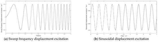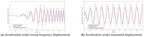 The displacement amplitude of the sweep signal is 0.01 m, and the frequency range is 0.1–5.0 Hz. In Figure 16a, as you can see, the controllable seat inertial suspension system’s acceleration spectrum is significantly reduced.