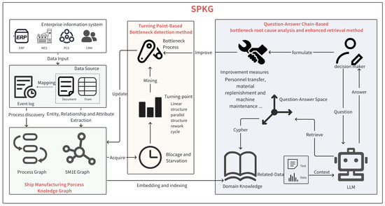 - A bottleneck mining method for ship manufacturing is proposed that can simultaneously solve the two types of problems of low accuracy in identifying dynamic bottlenecks and insufficient validity in analyzing them, which is named SPKG. The method integrates a data-driven “turning point” approach to identifying dynamic bottlenecks and introduces a production process knowledge graph to assist the large language models (LLMs) in analyzing the causes of bottlenecks, offering guiding suggestions to production decision-makers for improving bottlenecks.