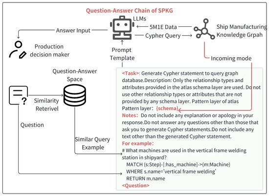 Therefore, on the basis of a knowledge graph, this section aims to use LLMs and augmented retrieval methods to enhance the efficiency and interpretability of analyzing a bottleneck’s root cause after its detection as described in Section 3.2. As described in Section 2.1, the graph structure offers the advantages of a high retrieval efficiency and integration of multi-source data, providing a data foundation for the subsequent bottleneck analysis. Meanwhile, since the constructed 5M1E subgraph is in graph structure and the data are stored in a graph database, currently, only Cypher queries can be used to query the graph database, and there is a lack of direct methods for the interaction between large models and graph databases. In addition, Cypher queries intuitively express nodes and relationships, which is crucial for querying and analyzing the complex relationships in knowledge graphs. Therefore, this paper opts to use Cypher to enhance the interaction capability between the LLMs and the graph database. Although the LLMs have some ability to generate Cypher, they lack knowledge of the manufacturing process knowledge graph, making it difficult for them to directly generate accurate Cypher queries. This paper constructs an SPKG Q&A chain to provide the LLMs with the ability to query the graph. As shown in Figure 2, the prompt includes the schema, the query examples, and the decision-maker’s questions. The schema is represented in a symbolic manner similar to Cypher language, including node attributes, relationship attributes, and relationships. The node attributes are represented as follows: NodeTypeAttributeName: DataType, AttributeName: DataType… The relationship attributes are represented as follows: RelationshipTypeAttributeName: DataType, AttributeName: DataType… The relationships are represented as (: NodeType)-[:RelationshipType]->(:NodeType). Following these three rules, all nodes and relationships are converted into strings and passed into the prompt as the schema. The prompt also contains several examples to help the LLMs learn how to generate accurate Cypher queries based on the questions. Each query example includes a question and the corresponding Cypher. When the decision-maker’s question is similar to a query example, the LLMs can more easily generate an accurate Cypher. For instance, given the aforementioned prompt, when the decision-maker asks, “What materials are used in cutting?”, since the prompt contains “What machines are used in cutting?”, the LLMs only need to slightly modify the Cypher in the query example. Furthermore, the Cypher in the example also organizes the retrieved content into a format that the LLMs can easily understand, such as concatenating the retrieved text and data into a semantic string, e.g., RETURN m.model + “ is used in cutting”.