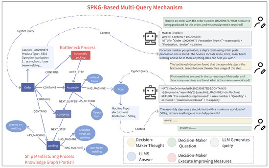 Theoretically, increasing the number of query examples in the prompt could enable the LLMs to address various questions [28,29]. However, including all possible questions in the prompt would inevitably exceed the token limit of the LLMs. Therefore, this paper introduces the concept of the Question-Query Space, which is implemented through the following process: (1) Predefine query examples based on the graph schema; (2) embed and store the questions from all query examples in a vector database; (3) when a user poses a question, perform similarity searches to find similar query examples from the Question-Query Space; and (4) incorporate the similar query examples into the prompt. Once the SPKG Q&A chain is established, decision-makers can analyze the root causes of bottlenecks through multiple rounds of inquiries. A typical example of multi-round questioning is illustrated in Figure 3. The decision-maker conducts three rounds of inquiries, aiming to obtain information regarding orders, machines, and processes. The LLMs generate corresponding Cypher queries to retrieve the 5M1E information on the bottleneck process as the context for the responses. The Cypher queries involve pattern matching, similarity searches, full-text searches, and multi-hop queries. After the LLMs responds, the decision-maker assesses whether the 5M1E information for the current bottleneck process meets the standards and requirements, systematically identifying causes before implementing corresponding improvement measures, such as personnel adjustments and machine maintenance.
