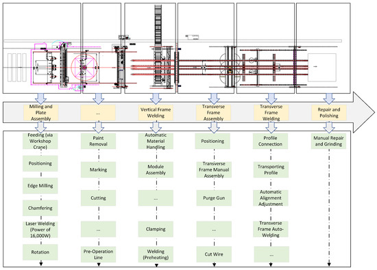 As shown in Figure 4, the entire production line consists of 6 workstations. Among these, the milling and plate assembly workstation is composed of 14 processes, including feeding (via workshop crane), positioning, and chamfering, among others. The cutting workstation consists of 12 processes, including paint removal, marking, and pre-operation, among others.