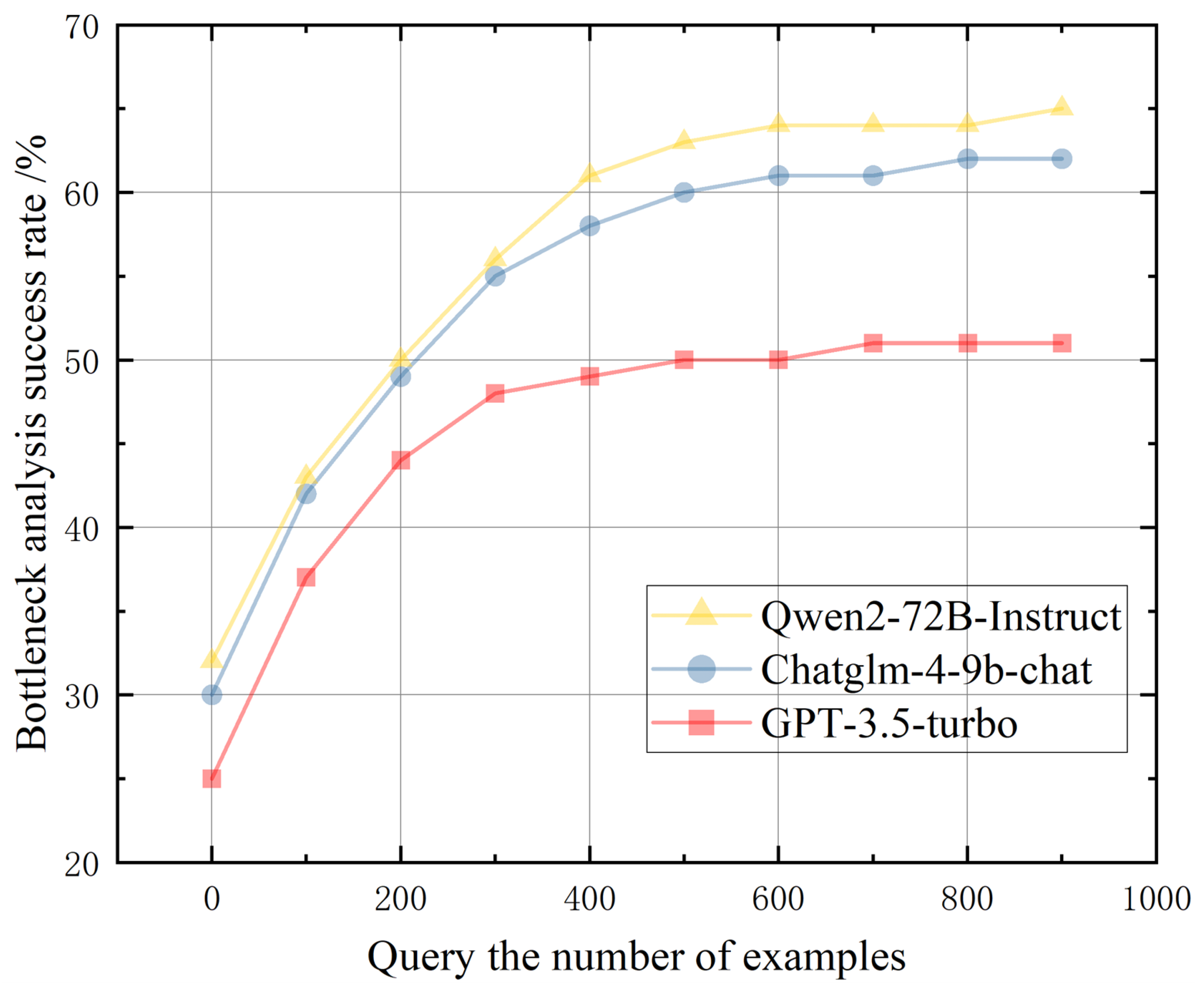 Adjusting the number of query examples in the Question-Query Space reveals the performance of SPKG in the bottleneck analysis, as illustrated in Figure 7. With an increase in the query examples, the success rate of the bottleneck analysis for all three LLMs rises significantly, but the rate of the increase gradually levels off. Once the number of query examples approaches a certain critical value, the success rate of the bottleneck analysis no longer changes appreciably, and the curve tends to flatten. This phenomenon occurs because a knowledge graph, with a defined number of node and relationship types, as well as attribute types, requires only a limited number of query examples to thoroughly describe its pattern layer. For the manufacturing process knowledge graph defined in this paper, this critical value is approximately 600 examples. After reaching this threshold, the success rate of the bottleneck analysis is constrained by the reasoning and code generation capabilities inherent to the LLMs themselves.