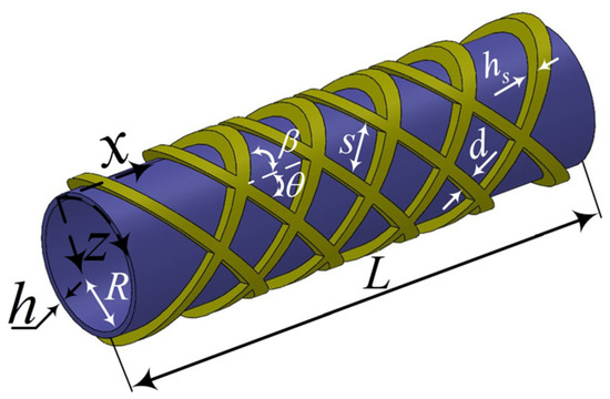 The configuration of OSMFG-CSs with length (), radius (), and thickness () is demonstrated in Figure 1. Also, as shown, the CSs are reinforced with external oblique stiffeners with thickness (), angles (), width (), and spacing ().