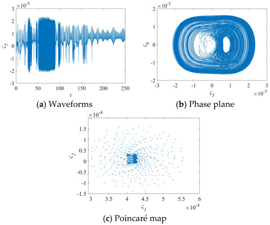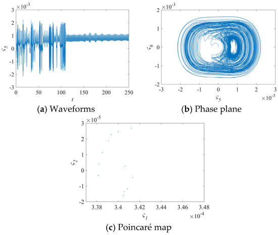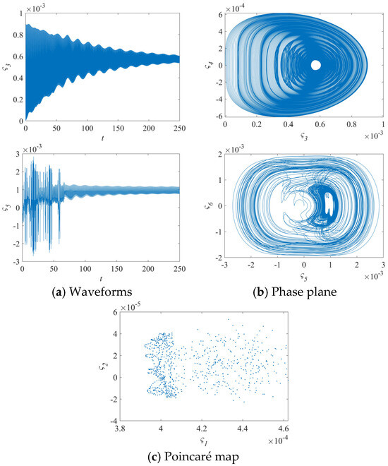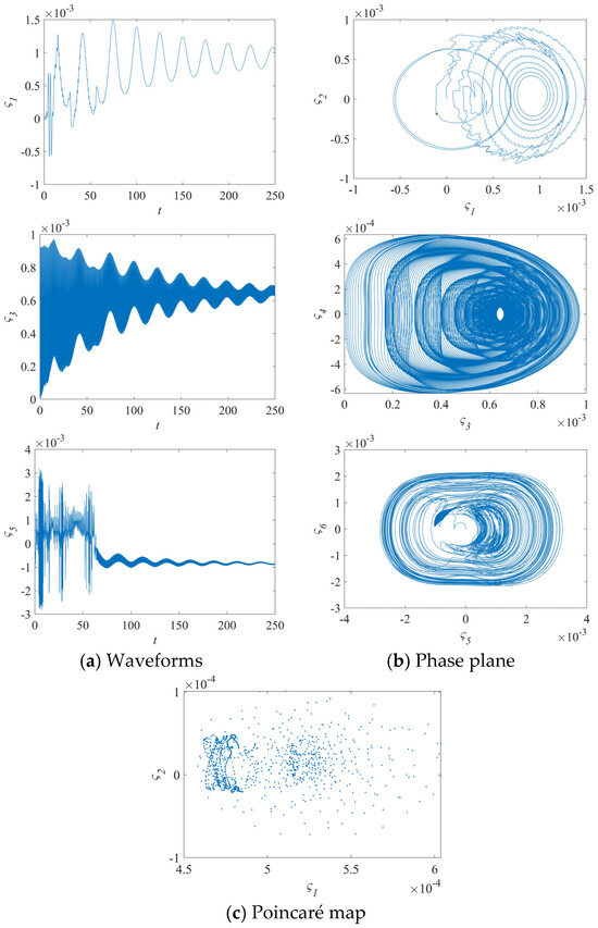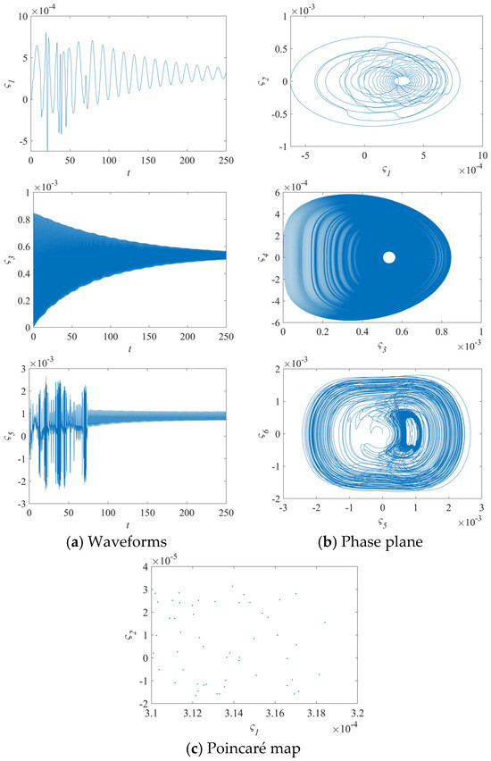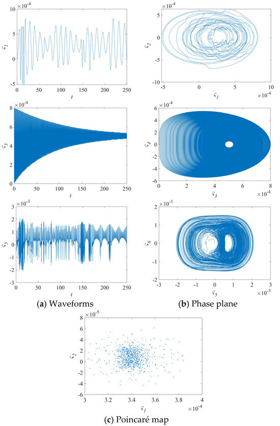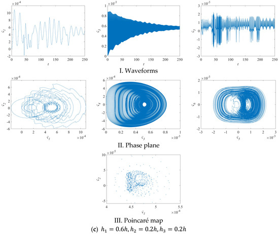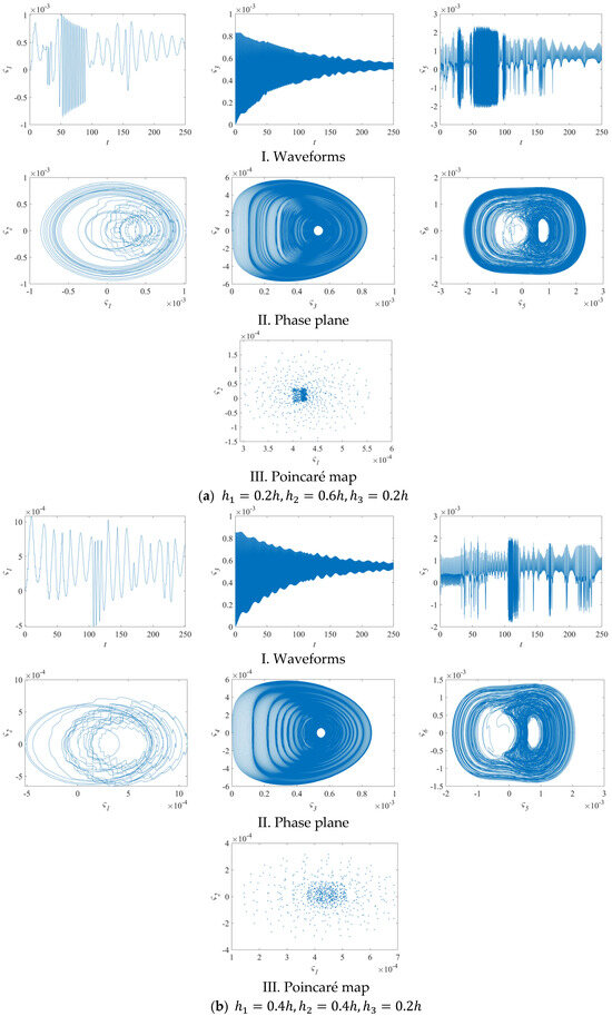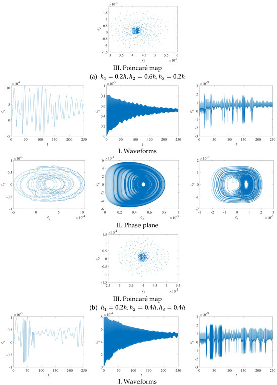 Figure 12 and Figure 13 illustrate the impact of the thickness of the shell layers on the NV responses of OSMFG-CSs. As shown in these figures, increasing the ceramic layer thickness generally increases the vibration amplitude in all three modes. Specifically, when the metal layer thickness equals that of the FG layer, the vibration amplitude significantly increases in the first mode but decreases in the third mode. Additionally, enhancing the ceramic layer thickness leads to a reduction in the vibration amplitude in the second and third modes. However, with a metal layer thickness equal to that of the FG layer, there is an increase in the vibration amplitude in the first mode. Also, the outcomes illustrate that OSMFG-CSs with stiffener angles of and for various shell layer thicknesses exhibit chaotic motion.