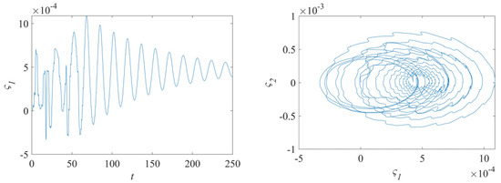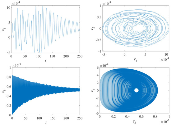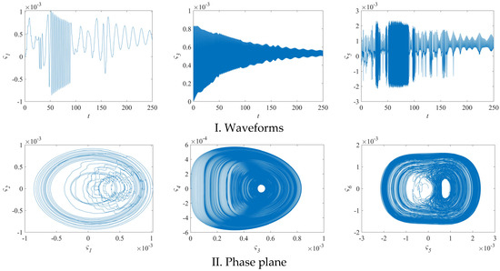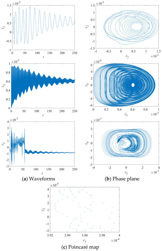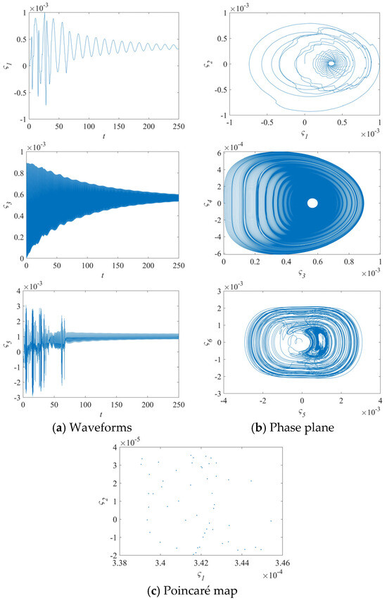 Equations (14) and (15) are first substituted into Equations (18)–(20). Next, the coefficients of and (perturbation coefficients) are set to zero. The general solutions for the coefficients of (i.e., ) are then determined and subsequently substituted into the coefficients of . This process results in three equations that include secular terms (i.e., terms proportional to ), their complex conjugates, and nonsecular terms. Finally, the secular terms in the three obtained equations are set to zero, leading to the following equations in complex form: