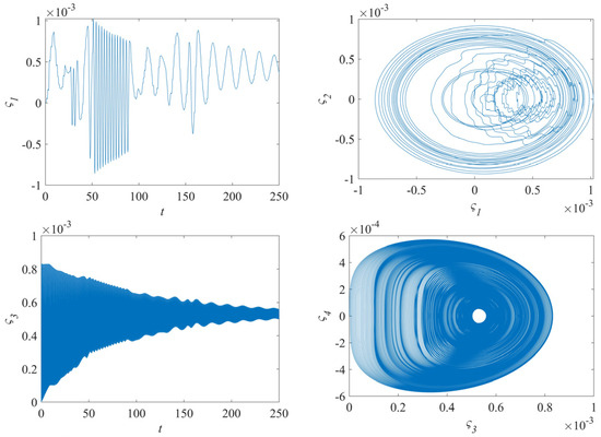 The impacts of the stiffener angle on the NV behavior and the NV phase plane of OSMFG-CSs with a superharmonic of order 3/1 and an internal resonance of 1:1/3:1/9 for the first three modes are revealed in Figure 4, Figure 5, Figure 6, Figure 7, Figure 8, Figure 9, Figure 10 and Figure 11. Regarding the outcomes, the vibration amplitudes of OSMFG-CSs in the first mode with stiffener angles of and , in the second mode when one of the stiffener angles is (either or ), and in the third mode with stiffeners angles of and or , are less than others. Conversely, the vibration amplitudes of OSMFG-CSs in the first mode with stiffener angles of and or , OSMFG-CSs in the second mode with stiffener angles of and , and OSMFG-CSs in the third mode with stiffener angles of and or or were larger than the others. Additionally, the results indicate that the time-domain curves of OSMFG-CSs in the first mode with stiffener angles of and or , OSMFG-CSs in the second mode with stiffener angles of and , and OSMFG-CSs in the third mode with stiffener angles of and or reach stability earlier than the others. In addition, the outcomes illustrate that OSMFG-CSs with various stiffener angles demonstrate periodic, quasi-periodic, or chaotic motion. In this regard, OSMFG-CSs exhibit chaotic motion at stiffener angles of and or or , as well as and . Conversely, OSMFG-CSs undergo quasi-periodic motion at stiffener angles of and or , and , and multiple periodic motions at stiffener angles of and .