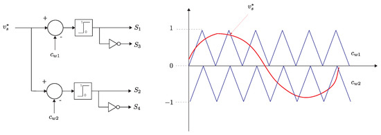 It should be noted that when using direct torque control and model predictive control techniques, all the vector voltages are used. This is not the case for PWM-based strategies, due the limitations introduced by the PWM modulation. In the case of the NPC converter topology, level-shifted PWM (LS-PWM) is the most commonly implemented technique, not space vector modulation (SVM), due to the complexity of the last and the restrictions in using redundancies, because of the particularities of this topology. Figure 3 shows the implementation of the LS-PWM for the 3L-NPC converter.