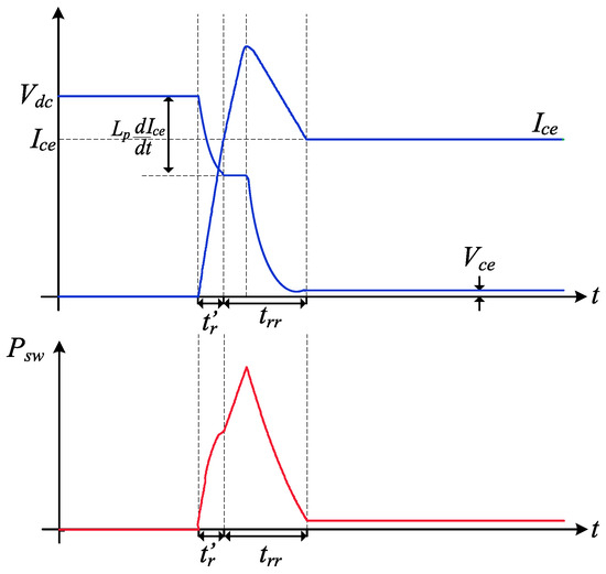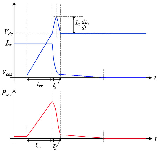 The off-time waveforms of the IGBT behavior are illustrated in Figure 5. The on-voltage in the IGBT , increases until it reaches the blocking voltage, . The change in voltage can be considered linear. The voltage waveform exhibits underdamped characteristics with an overshoot due to the parasitic inductance, . The current through the IGBT decreases rapidly and transfers to the freewheeling diode. Additionally, the rapid change in current explains the peak voltage during the commutation and the peak power value.