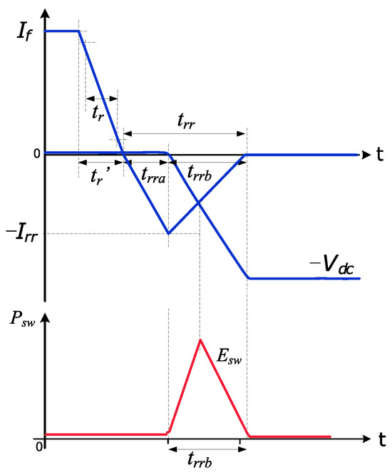 An important parameter to take into account when understanding the semiconductor loss mechanism is the reverse recovery time of the freewheeling diode. Before commutation, the current flows through the diode and then transitions to the IGBT after turning on. Due to the diode’s reverse recovery behavior, a current overshoot occurs, leading to a peak of power, as shown in Figure 4. Once passes, the voltage reduces to its nominal value , resulting in the consequent conduction losses.