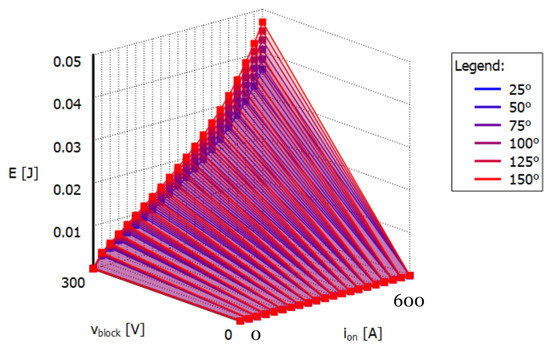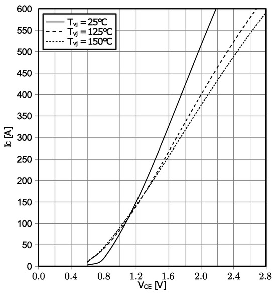 Figure 7 shows the collector current as a function of the collector–emitter voltage (). The conduction behavior is tested at different temperatures and gate voltages. These characteristics are introduced into the PLECS model for the conduction loss calculations.