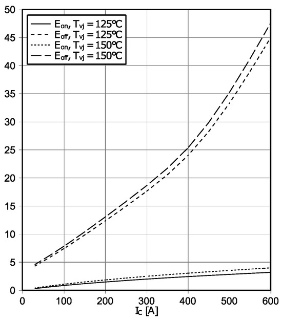 The switching losses depend directly on the switching frequency but also on the on and off energy. This energy is a function of the collector current and is represented by characteristic curves in the data-sheet of the semiconductor, shown in the Figure 8.