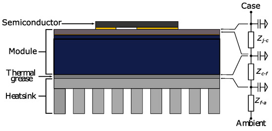 Switching and conduction power losses result in heat, which has to be transferred internally from the semiconductor to the environment through a heat sink. However, there are different layers to be taken into account between the semiconductor itself and the heat sink. Figure 10 and Figure 11 show the schematic of the heat transfer model, considering the different layers involved in this process [13].